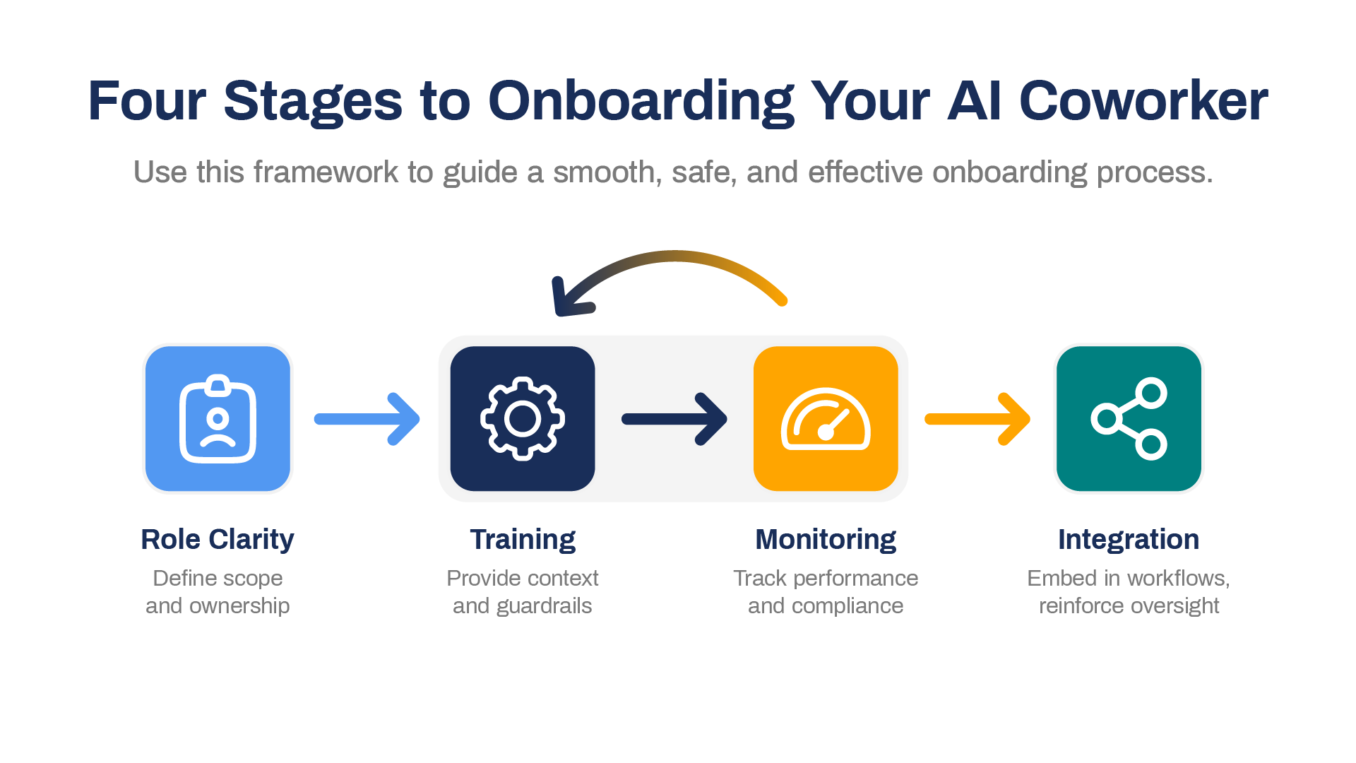 Here are four stages of onboarding your new AI agent as you would a coworker. At each stage, we’ve identified the key checks and conversations that help your “intern” ramp up safely and deliver consistent value.